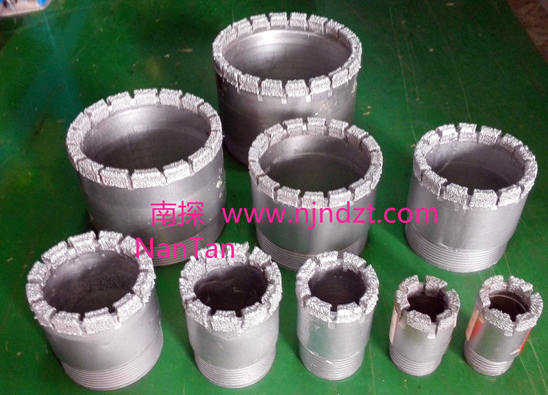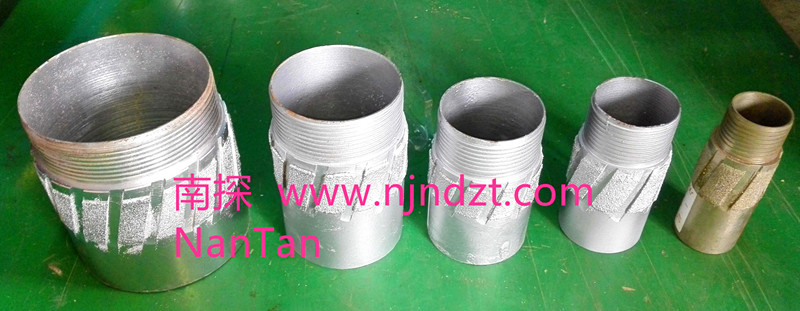 擴(kuò)孔器(電鍍金剛石):是連接在金剛石鉆頭與巖心管之間,起到擴(kuò)大孔徑和修整孔壁保證孔徑不縮小的一種鉆具。由于金剛石鉆頭直徑與巖心管外徑的尺寸相差很小,使孔壁與巖心管之間的間隙更加縮小,使過水受阻,并易造成卡鉆。金剛石擴(kuò)孔器是一短柱狀管體,上下鋼體部分有絲扣分別與鉆頭和巖心管相連,中間部分是覆蓋含金剛石的胎體,其外徑略大于金剛石鉆頭直徑(2毫米左右),胎體側(cè)表面上有過水水槽,使水流通過。在極堅硬易磨性的巖層,也有使用兩個和多個擴(kuò)孔器,除一個裝在鉆頭的上部以外,其余的間隔地裝在巖心管之間。